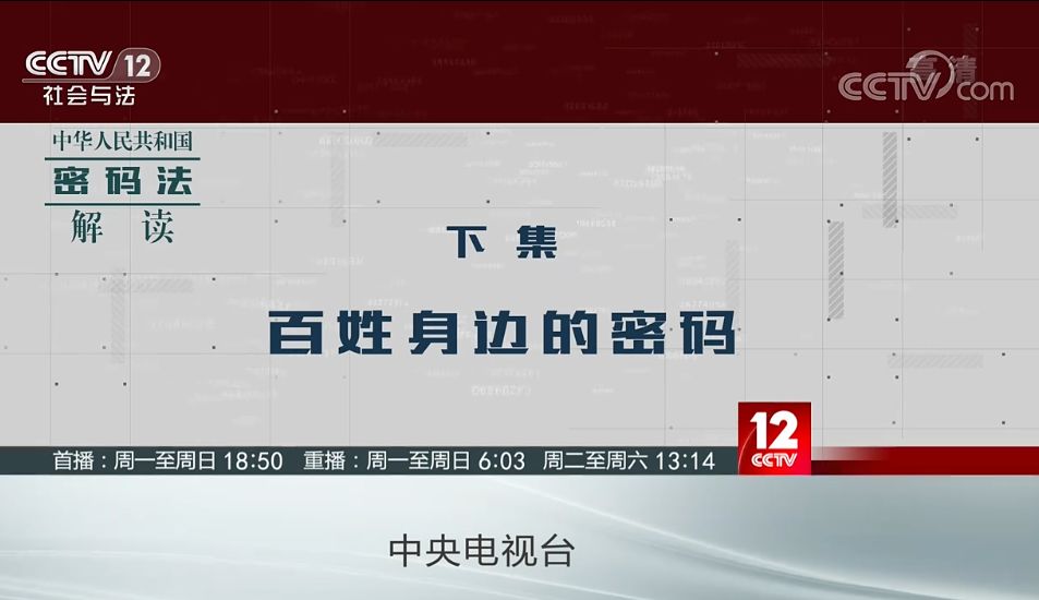 刚才为您讲述了核心密码和普通密码,而密码除了用于保护国家秘密,也与我们老百姓的生活息息相关。那么,密码在我们的日常生活中都有哪些应用?密码法又是怎么规定的呢?我们将在明天的节目中继续为您讲述。